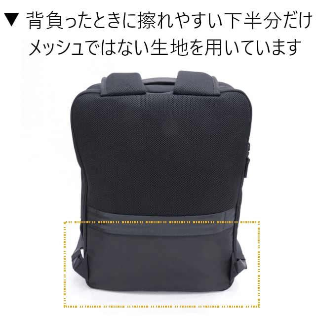 背面は下半分は本体生地を採用することで摩擦を軽減しつつ通気性も両立。