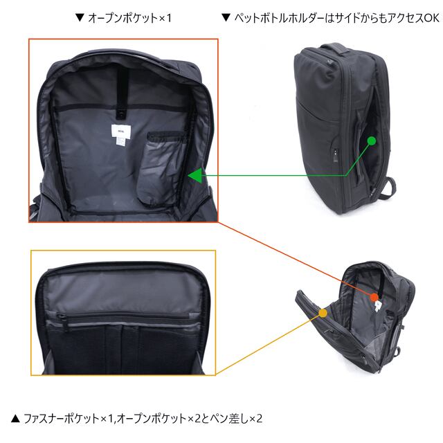 「リュックは途中でものを取り出しづらい」という弱点をデザインでカバーする仕様は以前のモデルから変わらず、折りたたみ傘やペットボトルはサイドから取り出し、