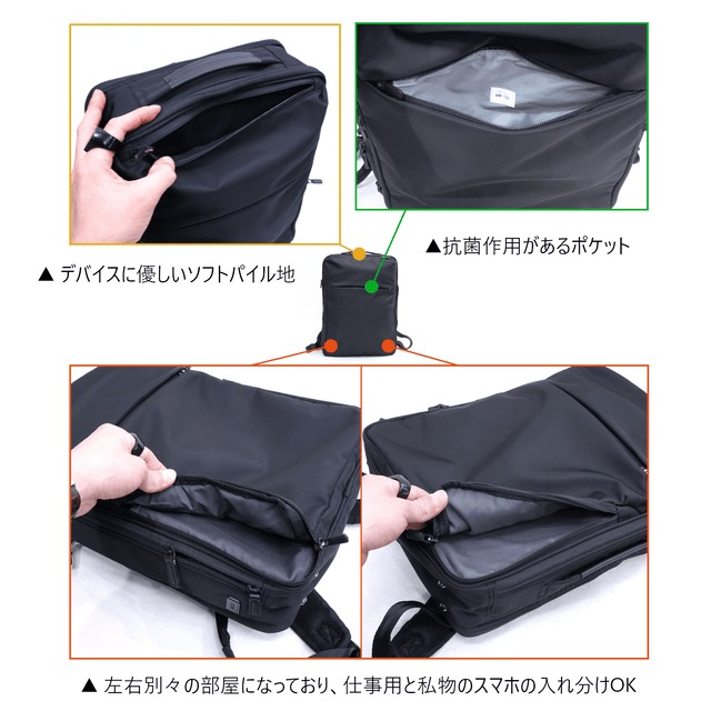 ・側面ファスナーと本体気室の双方から物の出し入れが可能なポケット