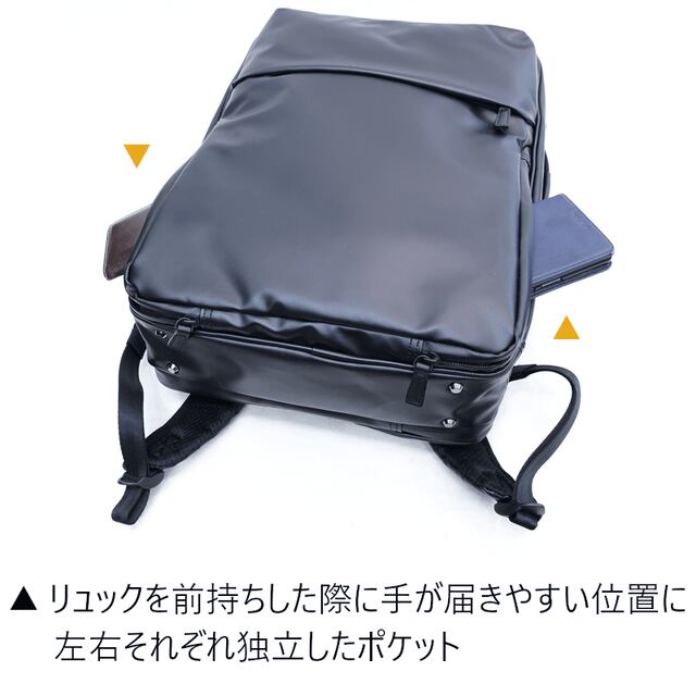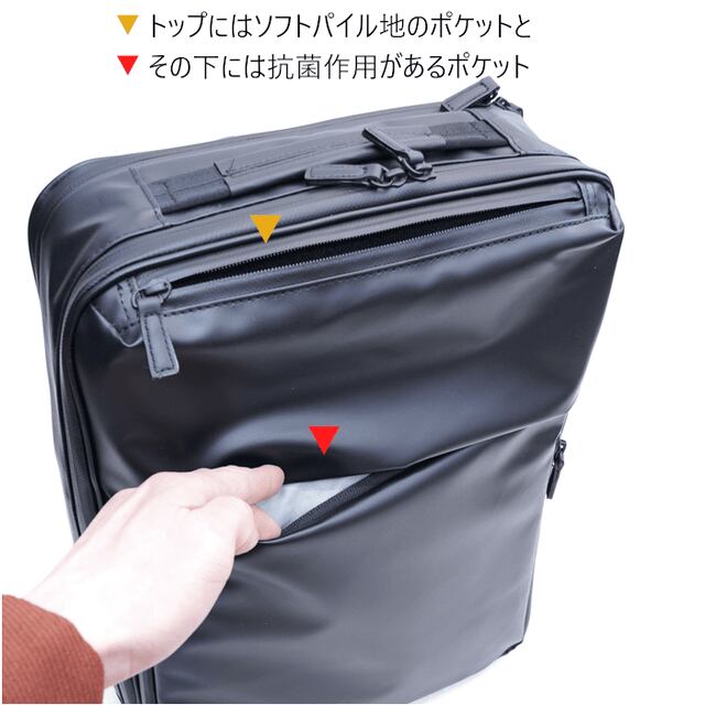 ・側面ファスナーと本体気室の双方から物の出し入れが可能なポケット