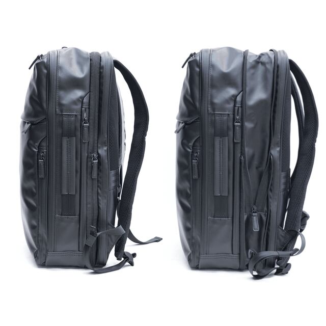 「リュックは途中でものを取り出しづらい」という弱点をデザインでカバーする仕様は以前のモデルから変わらず、折りたたみ傘やペットボトルはサイドから取り出し、