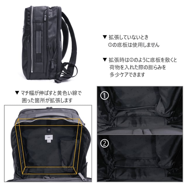 ・側面ファスナーと本体気室の双方から物の出し入れが可能なポケット