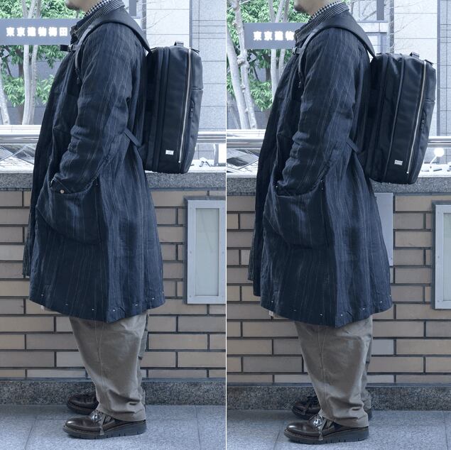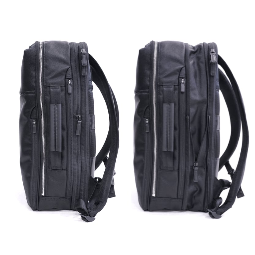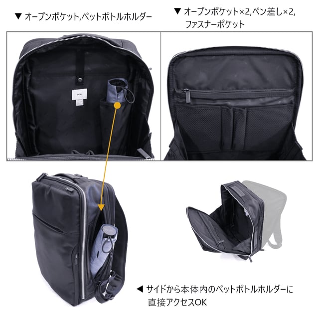 「リュックは途中でものを取り出しづらい」という弱点をデザインでカバーする仕様は以前のモデルから変わらず、折りたたみ傘やペットボトルはサイドから取り出し、