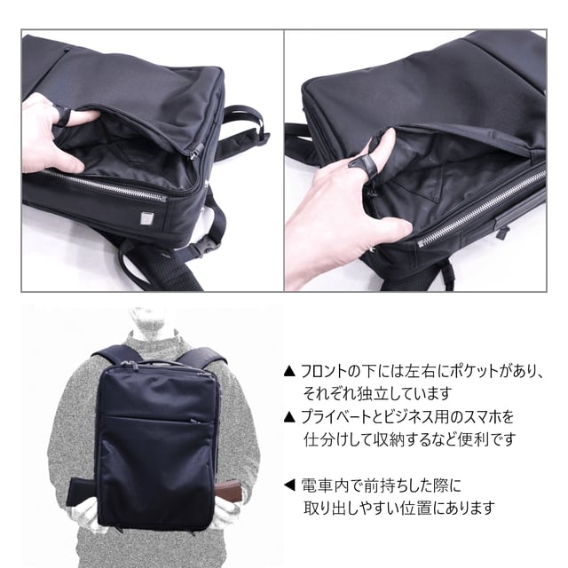 ・側面ファスナーと本体気室の双方から物の出し入れが可能なポケット