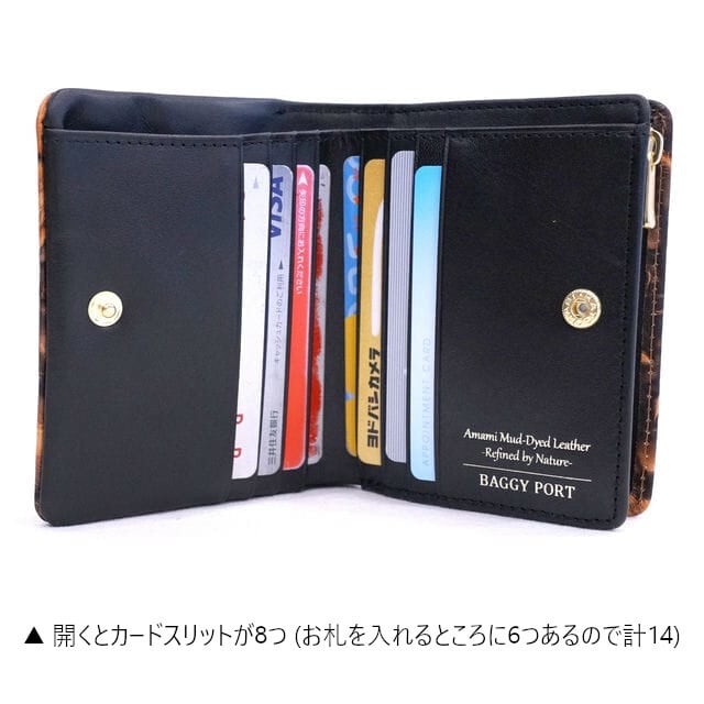 コンパクトなサイズながらカードは14枚も収納でき、モチロン小銭やお札の収納もOK